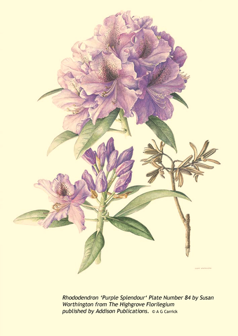 Susan described a florilegium as a collection of flower paintings that record plants in a given period of time or place. It is like a historical time capsule and may record hybrid plants, which if they go out of fashion, can be lost. The Highgrove Florilegium project was created to celebrate the 60th birthday in 2008 of HRH The Prince of Wales. It became a seven year project involving 72 botanical artists from all over the world producing 124 paintings of the plants and trees growing in his garden at Highgrove in Gloucestershire. The projects panel of experts included representatives of the Chelsea Physic Garden who had seen Susans 2006 Rhododendron portfolio and viewed her as a rhododendron expert. In 2007 she was back in New Zealand when she received a request to paint Rhododendron Purple Splendour which had been one of the Queen Mothers favourites. It was still in flower at Pukeiti and she completed the painting. The panel deemed it a most beautiful, sensitive and refined painting and asked her to paint Rhododendron Scarlet Wonder. She replied that they would have to wait until the end of the year as it was no longer in flower. When asked for a third painting she selected Aesculus hippocastanum, the English horse chestnut as she already had preparatory drawings. Susan, the only New Zealand artist selected for the project, was honoured in 2010 when the Taranaki Electrical Trust gifted The Highgrove Florilegium to the people of Taranaki. The two volume book set is in the Puke Ariki collection in New Plymouth.