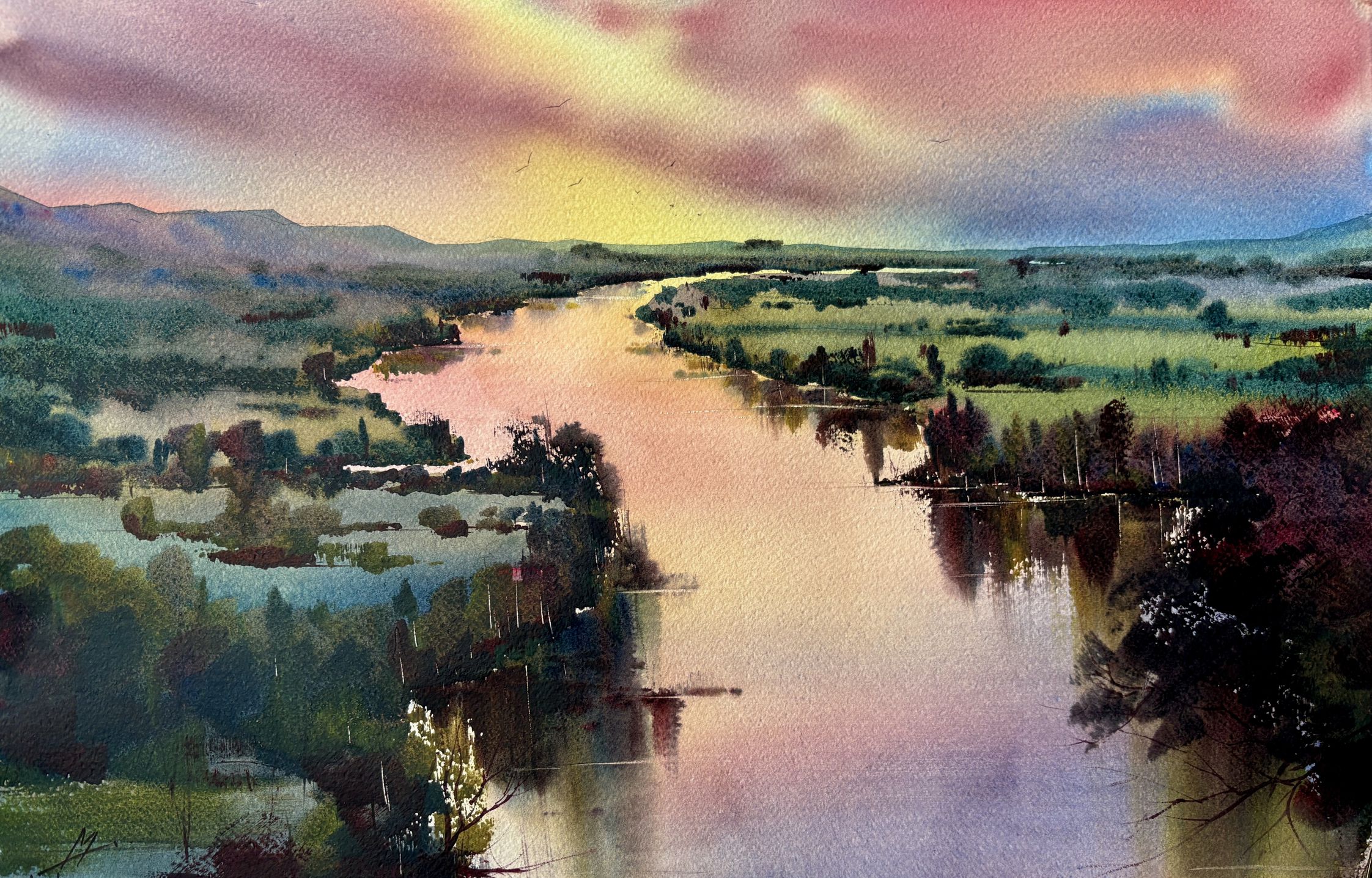 Artist’s comment:I am a Hamilton-based watercolour artist. I gravitate towards bold, expressive, impressionist landscapes that capture the raw natural beauty of New Zealand. My aim is to portray a sense of grandeur, wonder, mystery and beauty. Most of my inspiration comes from the beautiful landscapes of the Waikato region. This painting depicts an aerial view of the Waikato River where its waters are temporarily arrested by the Karapiro dam, hence the title Still waters. Looking north, the foothills of Mt Maungatautari are shown on the left horizon. To the right, an expanse of lush green fields, so characteristic of the Waikato, reflect the last rays of receding daylight.