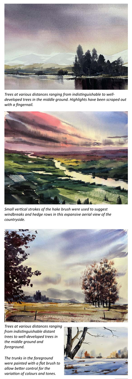 At first sight, the hake brush may appear as a large and cumbersome tool, but in reality, it is an incredibly versatile and delicate instrument. When loaded well, the edge of the brush is razor-sharp allowing you to paint straight lines such as tree trunks and major branches. The corner of the brush can be used to make triangular vertical strokes for distant trees or loose foliage. A semi-dry brush will bend and maintain its shape allowing you to stamp, drag or feather in large sections of foliage quickly and efficiently. And a dry brush used very lightly from a variety of angles can produce the impression of fine twigs on skeleton trees as well as ground cover. The flat brush can be used for more delicate shaping of tree trunks and major branches and the rigger is best for painting finer branches that have a convincing natural character. To achieve a tapering branch, press a loaded rigger down and drag out the branch using jerky movements reminiscent of a trout swimming up a stream followed by a quick flick at the end. A plastic card, palette knife or fingernail can be used to scrape out some highlights in darker areas to create contrast but do this sparingly. The most important aspect of fast and loose painting is that it is precisely that: fast and loose. Its spontaneous, impressionistic, and not constrained. There is an element of randomness. The spontaneity of the brush strokes adds to the beauty, quality and visual consistency of the painting. Most fast-and-loose paintings can be completed in half an hour, and many can be done in a single session without drying and re-glazing. As with all watercolour techniques, judging the water content can be tricky and requires practice.