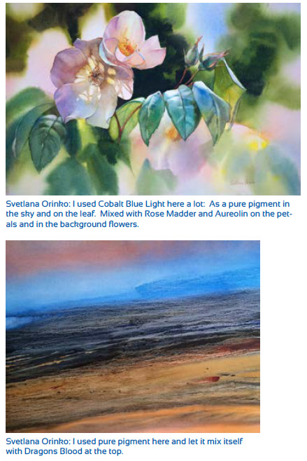 I use cobalt blue for the sky in landscapes, starting by wetting the paper, then painting from the top down, which gives a realistic gradient. I also find Cobalt Blue useful for painting sea and mountains and I mix Cobalt Blue with different shades of yellow as it makes amazingly vibrant light and dark green tones. It can be mixed with red tones to produce a lovely purple. I use Cobalt Blue and Indigo mixed together to make an