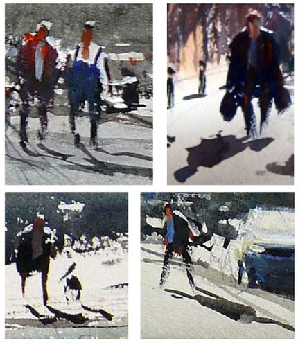 Practise painting from the head down, wet-in-wet. Try skipping the pencil work and drawing your figures with the brush only. Let the paint flow, then leave it alone. No fiddly-diddling!