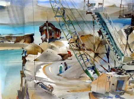 When setting a figure in a scene, ensure that heights make sense in relation to doorways, vehicles, lamp-posts, furniture and other figures. Figures can add emphasis to features in the picture eg. small figures against a tall building, a little mountaineer in an alpine scene. Watercolour New Zealand member and tutor Ted Sherwen uses figures here to give the viewer a sense of the quarry space and the size of the machinery.