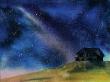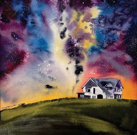 • 24 hours later, when the sky is bone dry, mask the house and the ground. Use an old stiff brush and pure white pigment out of the tube to flick in the stars, far away galaxies and the Planets. You could attempt to define the Matariki constellation in a dark area near the horizon.