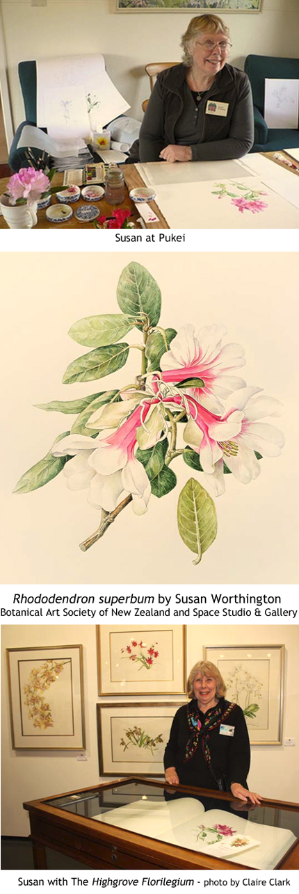 In 2014 twenty-three of Susans superb portfolio of large-leaf Rhododendron paintings were e-published internationally in THE PUKEITI LARGE-LEAF RHODODENDRONS The Watercolour Drawings of Susan Worthington by Addison Publications, London in association with The Pukeiti Rhododendron Trust Inc. New Zealand. Susan said that the paintings were produced in 2011 when she was snowed in at Pukeiti Lodge during one of Taranakis coldest winters. Some of the species flowered for the first time and she had only hours to record their details before they spoiled in the heat of the lodge. The laundry became her cool room to store blooms.