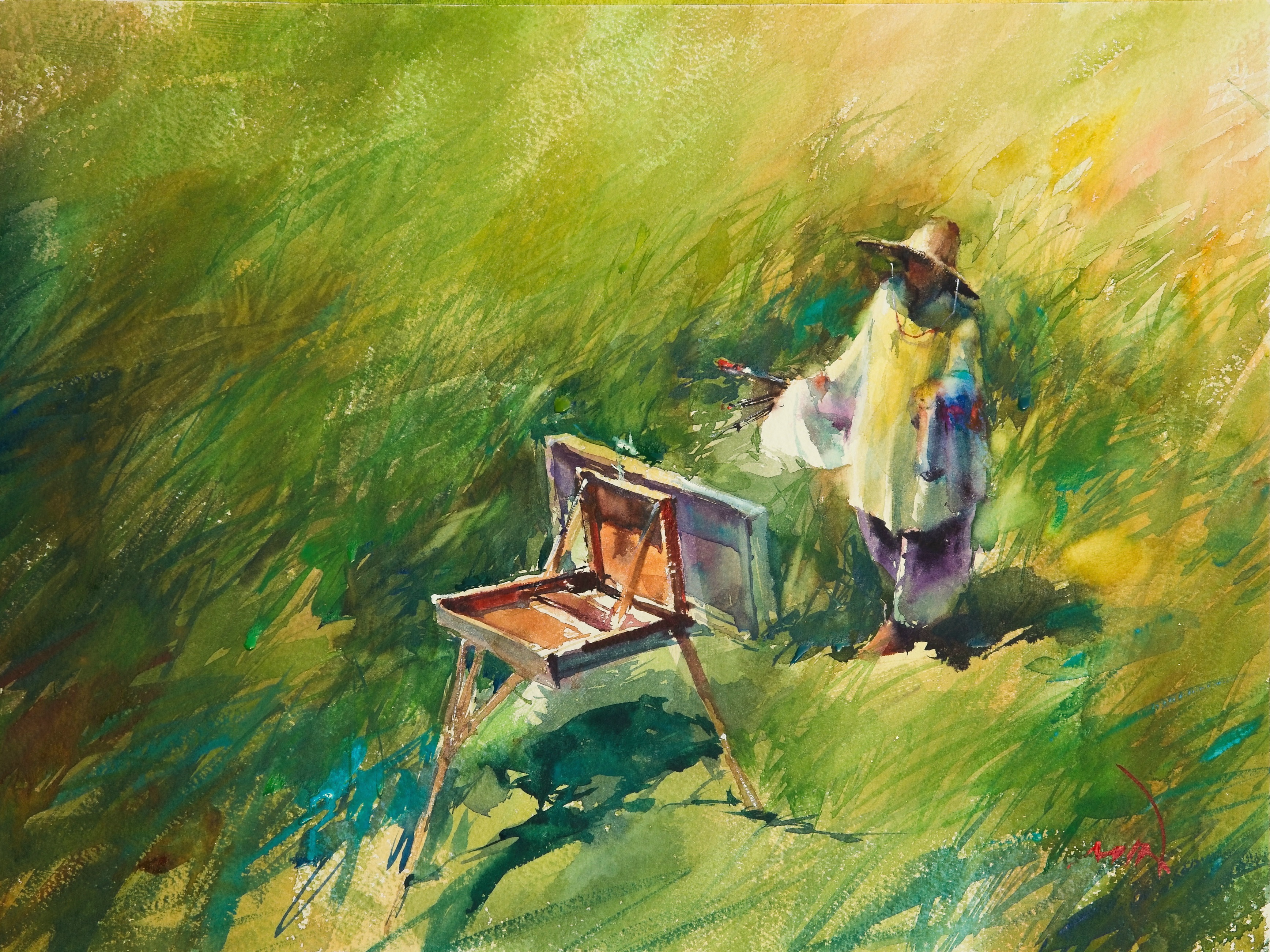 Judges’ comment: Intense colour and light against dark draw you into this painting. The focus on the artist and the easel is captured with just enough detail. The work is beautifully painted with soft and hard edges.