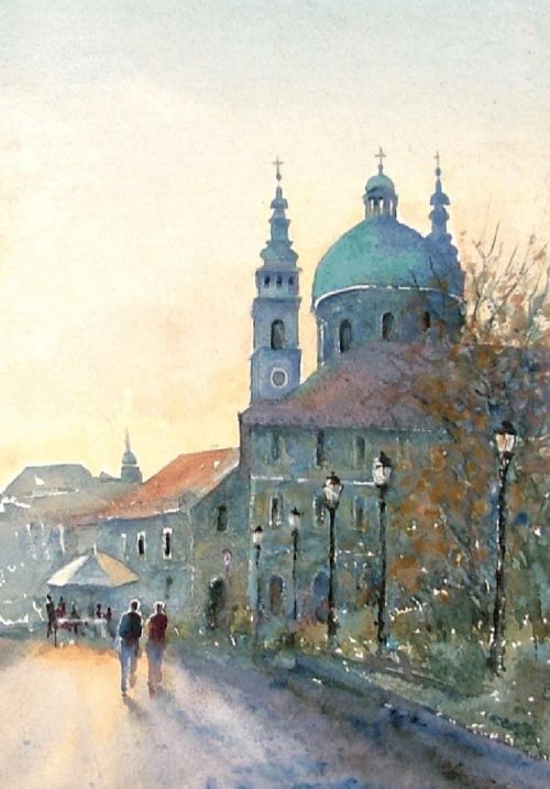 Shirleys caption for this painting reads In Ljubijana we climb the castle tower and look out across the spires of the city below to the blue mountains beyond. The river with its many ornate bridges snakes through the heart of the city. One bridge is protected by mighty dragon statues at either end.