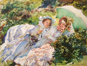 After 1900, watercolour painting became a major part of Sargents artistic output. He set aside around three months of each year (generally August-October) for plein air painting trips around Europe. His friend and biographer Evan Charteris wrote But it was away from his portraits, on the canals of Venice or the plains of Palestine, in the passes of the high Alps or among the dancers of Spain, or the fountains and cypresses of Italy and the gardens of Sicily, or, again, at Capri or Corfu, or on any one of the countless journeys that he made with friends, that his spirit was most at ease and serene - anywhere, in fact, where he could make the best of an emergency as he called painting a water-colour. And an emergency was seldom wanting.