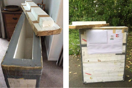 One member has designed and built a courier box that is light, strong, easy in/easy out and has proved to be durable. It is also inexpensive and reasonably simple to construct. Here is her recipe.