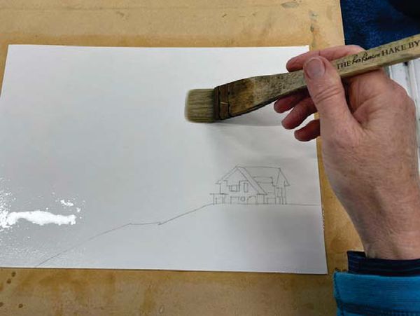 • Brush clean water on the back of the paper with a hake brush. Take your time to wet thoroughly so the paper absorbs the water