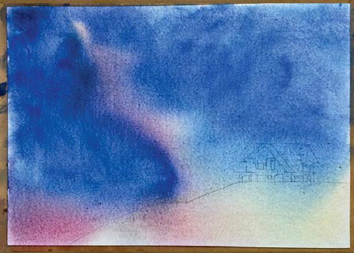 • When its all completely dry and you can get a hard edge, paint in the foreground, mix a grey and paint the house in silhouette