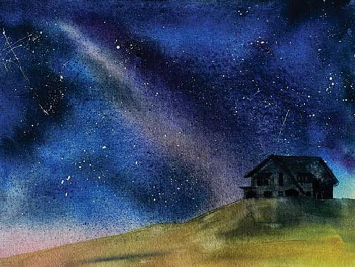 • 24 hours later, when the sky is bone dry, mask the house and the ground. Use an old stiff brush and pure white pigment out of the tube to flick in the stars, far away galaxies and the Planets. You could attempt to define the Matariki constellation in a dark area near the horizon.